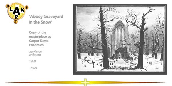 Copy of the Masterpiece by Caspar David Friedrich - Acrylic on Art Board 18x24" 1987. Original painted in 1810, alternative title Monastery Graveyard in the Snow. I think the original size is closer to 48x60"