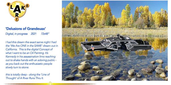 I had this dream the exact same night I had the ‘We Are ONE in the SAME’ dream out in California. This is the digital Concept of what I want to be an Oil Painting. It’s Kennedy in his assassination limo reaching out to shake hands with an adoring public - as you back out the enthusiastic people slowly turn to stone. This is totally deep - along the ‘Line of Thought’ of A River Runs Thru It.