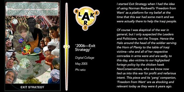 I started Exit Strategy when I had the idea of using Norman Rockwell’s ‘Freedom from Want’ as a platform for my belief at the time that this war had some merit and we were actually there to help the Iraqi people. Of course I was skeptical of the war in general, but I only suspected the Leaders and Politicians, not the Troops. Hence the Halo around the head of the soldier serving the Horn of Plenty to the table of Iraqi victims—she and all of her respective comrades in arms were and are sadly, to this day, also victims to our high jacked foreign policy by the chicken hawk Neo Conservatives, who we know now lied us into this war for profit and nefarious intent. This piece and its ‘yang’ companion, ‘Freedom from Want’ are as shocking and relevant today as they were 15 years ago.
