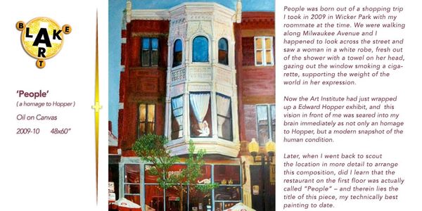 People was born out of a shopping trip I took in 2009 in Wicker Park with my roommate at the time. We were walking along Milwaukee Avenue and I happened to look across the street and saw a woman in a white robe, fresh out of the shower with a towel on her head, gazing out the window smoking a cigarette, supporting the weight of the world in her expression. Now the Art Institute had just wrapped up a Edward Hopper exhibit, and this vision in front of me was seared into my brain immediately as not only an homage to Hopper, but a modern snapshot of the human condition. Later, when I went back to scout the location in more detail to arrange this composition, did I learn that the restaurant on the first floor was actually called “People” – and therein lies the title of this piece, my technically best painting to date.