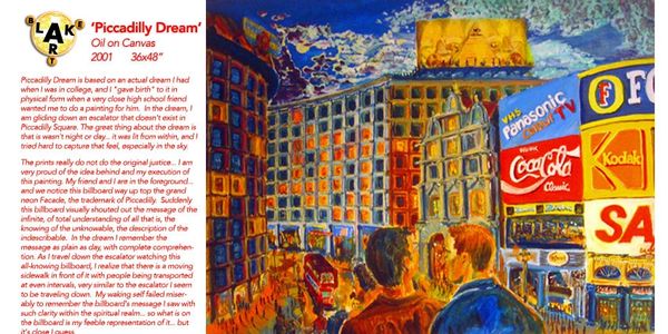 Piccadilly Dream is based on an actual dream I had when I was in college, and I "gave birth" to it in physical form when a very close high school friend wanted me to do a painting for him. In the dream, I am gliding down an escalator that doesn't exist in Piccadilly Square. The great thing about the dream is that is wasn't night or day... it was lit from within, and I tried hard to capture that feel, especially in the sky. • The prints really do not do the original justice... I am very proud of the idea behind and my execution of this painting. My friend and I are in the foreground... and we notice this billboard way up top the grand neon Facade, the trademark of Piccadilly. Suddenly this billboard visually shouted out the message of the infinite, of total understanding of all that is, the knowing of the unknowable, the description of the indescribable. In the dream I remember the message as plain as day, with complete comprehention. As I travel down the escalator watching this all-knowing billboard, I realize that there is a moving sidewalk in front of it with people being transported at even intervals, very similar to the escalator I seem to be traveling down. My waking self failed miserably to remember the billboard's message I saw with such clarity within the spiritual realm... so what is on the billboard is my feeble representation of it... but it's close I guess.