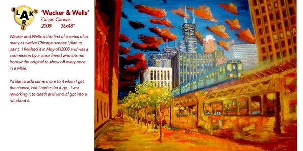 Wacker and Wells is the first of a series of as many as twelve Chicago scenes I plan to paint. I finished it in May of l2008 and was a commission by a close friend who lets me borrow the original to show off every once in a while. • I'd like to add some more to it when I get the chance, but I had to let it go - I was reworking it to death and kind of got into a rut about it.