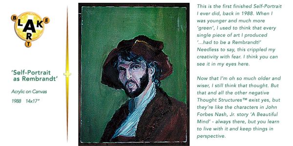This is the first finished Self-Portrait I ever did, back in 1988. When I was younger and much more ‘green’, I used to think that every single piece of art I produced ‘...had to be a Rembrandt!’ Needless to say, this crippled my creativity with fear. I think you can see it in my eyes here. • Now that I’m oh so much older and wiser, I still think that thought. But that and all the other negative Thought Structures™ exist yes, but they’re like the characters in John Forbes Nash, Jr. story ‘A Beautiful Mind’ - always there, but you learn to live with it and keep things in perspective.